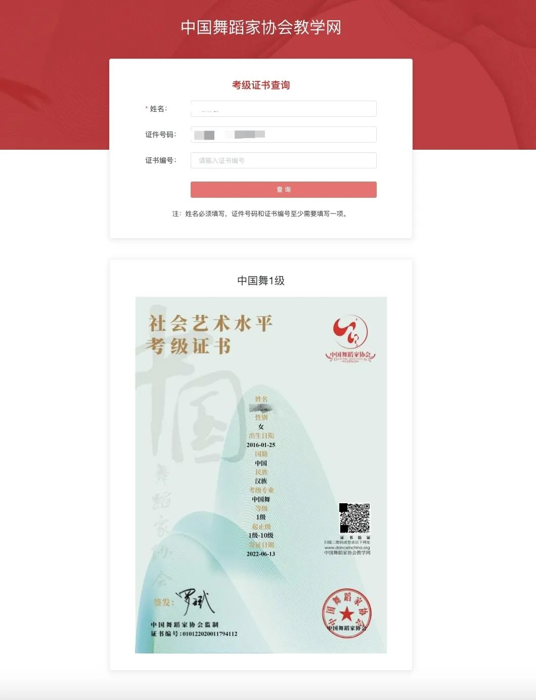 证件号码和证书号码至少需要填写一项